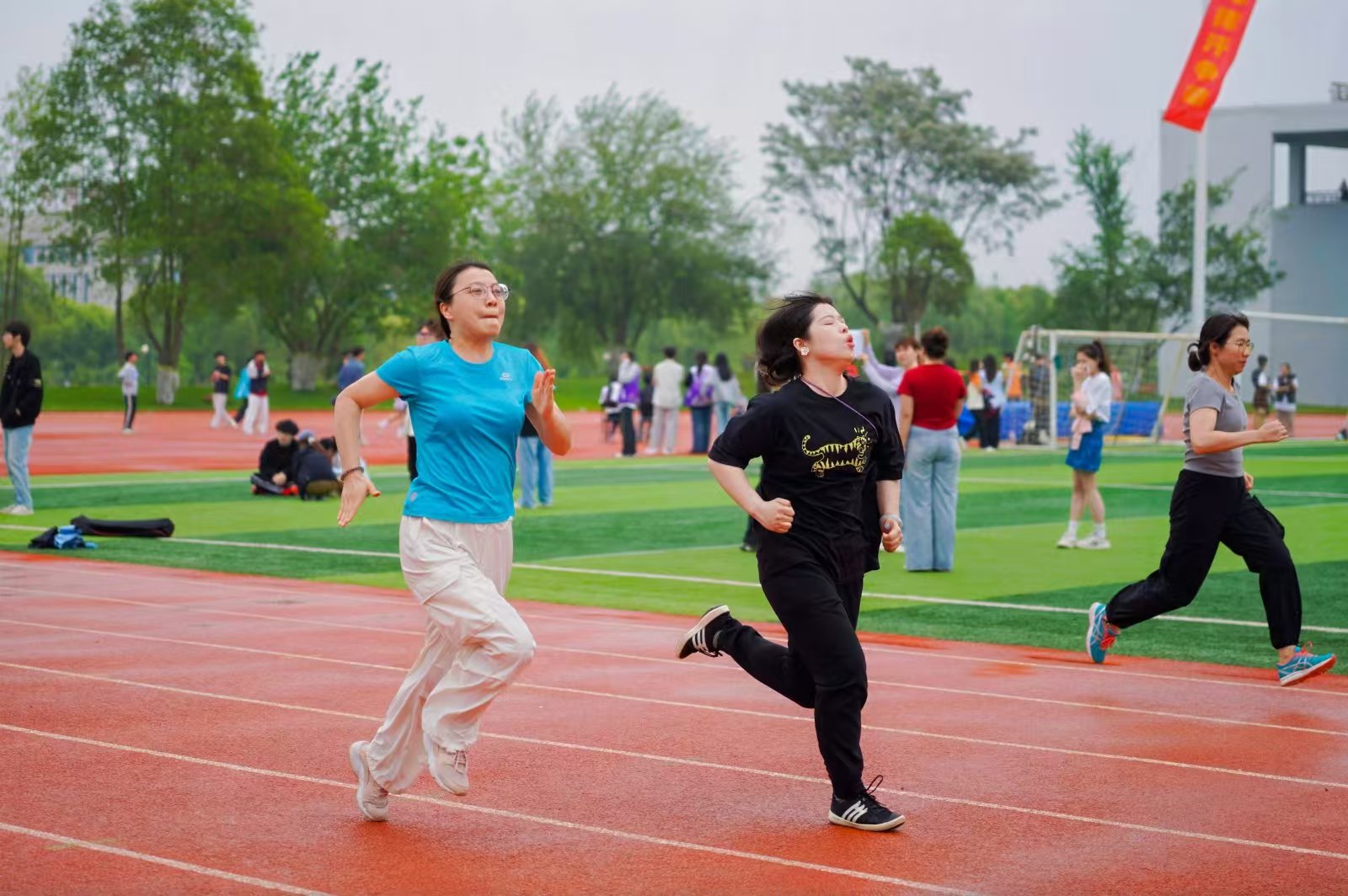 发令枪响过后,教师们并肩冲出、步伐铿锵,伴随着阵阵欢呼,赛道上的他们尽显昂扬风采!