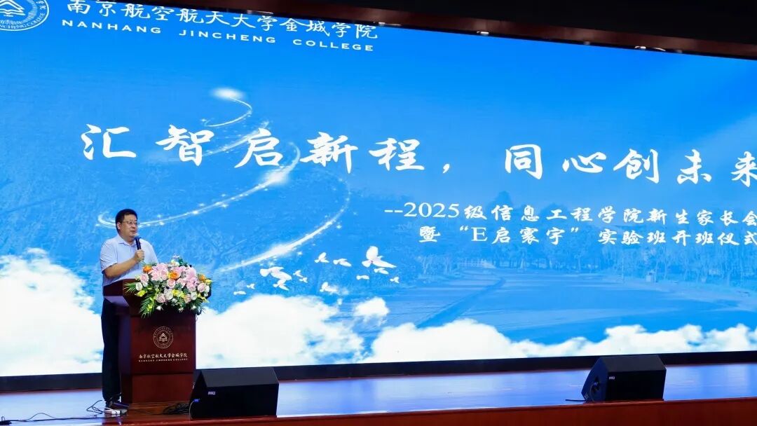 2025年8月31日11:00,南京航空航天大学金城学院信息工程学院2025级新生家长会暨“E启寰宇”实验班开班仪式在图书馆206报告厅隆重举行。本次活动以“汇智启新程 同心创未来”为主题,聚焦家校协同与国际化人才培养,全面展示学院育人理念与培养特色,为新生大学生活奠定坚实基础。
