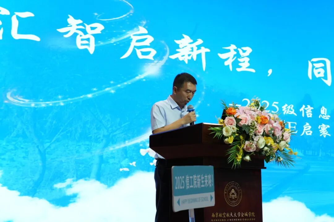 本次活动由信息工程学院党总支书记唐亮主持。南京航空航天大学金城学院副校长郭建礼、国际教育学院副院长孙成行、学生工作处副处长田小宁、信息工程学院院长闻凯、党总支书记唐亮、副院长谭静、副书记吴倩等校院领导,以及教师代表吴少淳教授、刘忠利教授、李颖教授、新生辅导员、2025级新生与家长代表共同出席。
