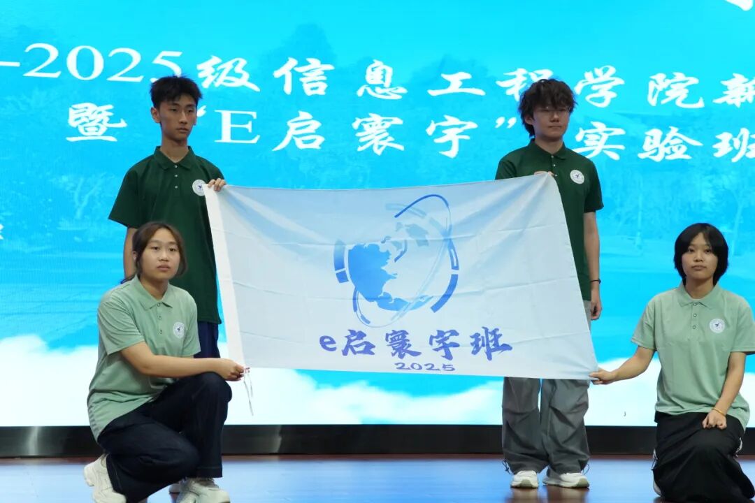 活动中,2024级“E启寰宇”班学生代表为实验班进行授旗仪式,班旗象征班级凝聚力与奋斗精神寓意着班级的同学们能够通过计算机技术链接世界,开创未来。