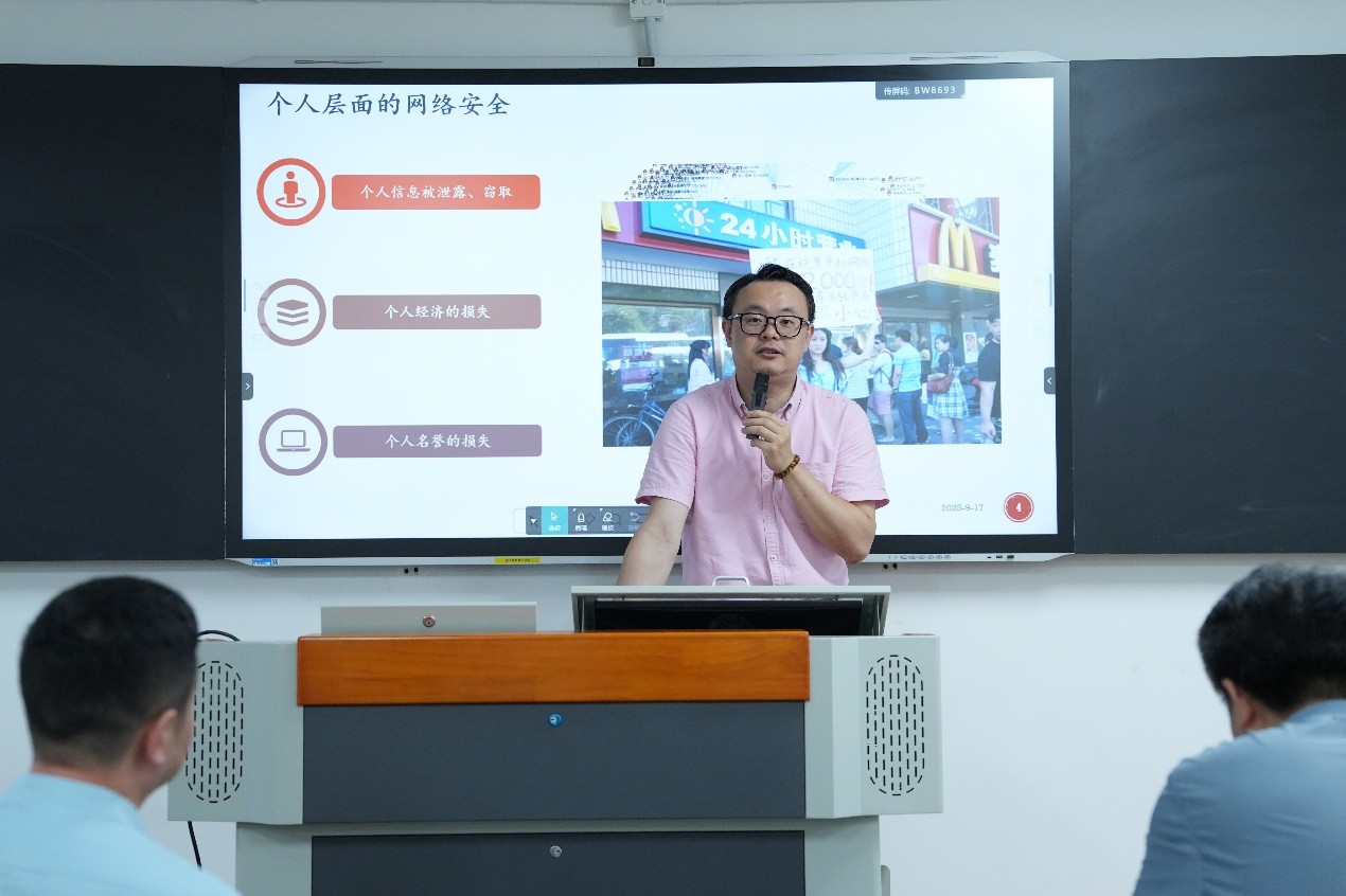 • 宗中老师以“信息安全意识培训”为主题,从国家、企业和个人三个层面剖析了网络安全问题的根源,强调“人”是信息安全中最关键的因素。他系统讲解了信息安全的三要素(保密性、完整性、可用性),并结合案例介绍了弱口令、网络钓鱼、社会工程学攻击等常见安全威胁,提出要养成良好的安全习惯,如规范设置密码、谨慎点击未知链接、及时更新系统补丁、注意移动介质安全等。同时,他还结合《网络安全法》等相关法规,提醒教师要依法依规使用网络,做到“提升意识、规范行为、防范风险”。