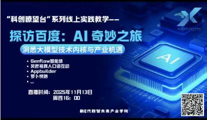 第四期活动《“科创瞭望台”—— 探访百度-AI奇妙之旅:洞悉大模型技术内核与产业机遇》于11月13日下午16:00正式开播,活动通过线上形式进行,旨在为师生提供便捷的渠道,足不出户就能了解最新的行业知识与科技成果 。