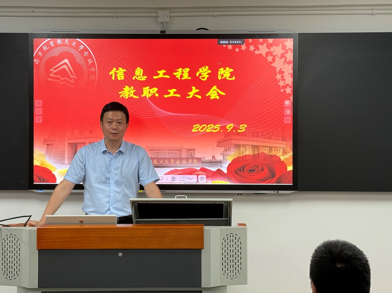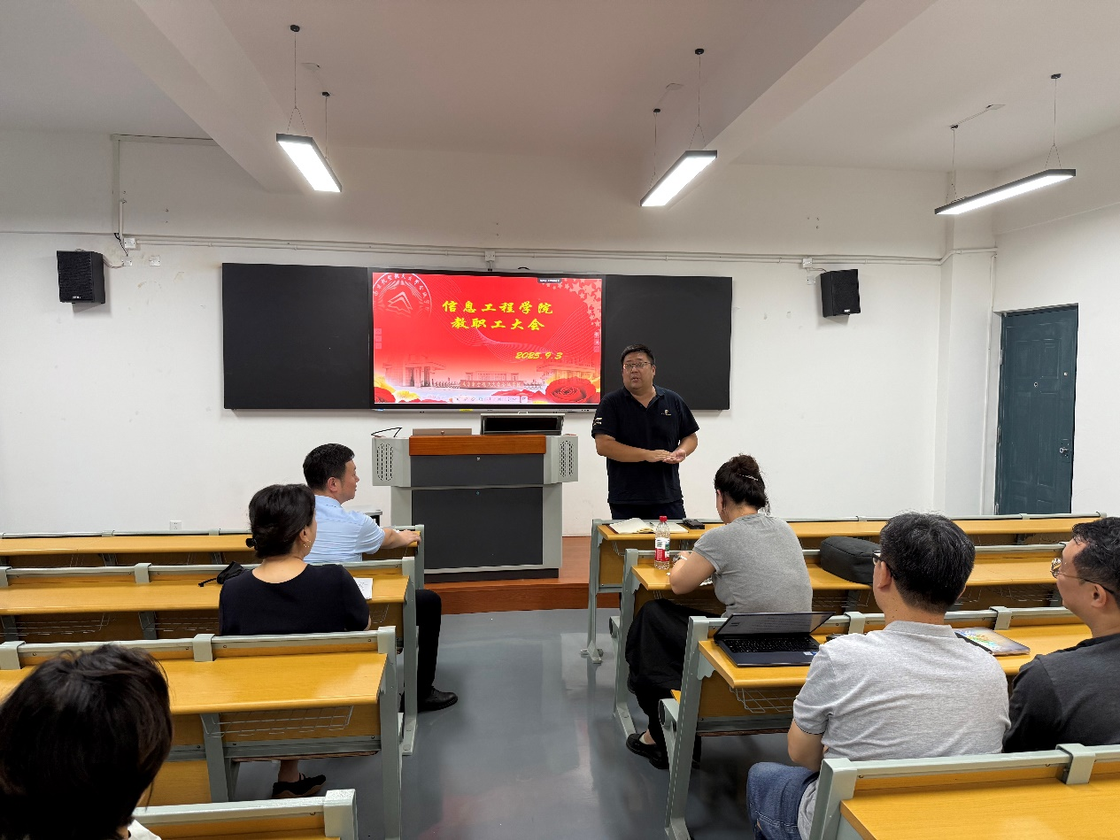 2025年9月3日下午,信息工程学院在行知楼302召开新学期全院大会,全体教师、辅导员及行政人员参加会议。学院院长闻凯、党总支书记唐亮、副院长谭静、副书记吴倩出席会议。