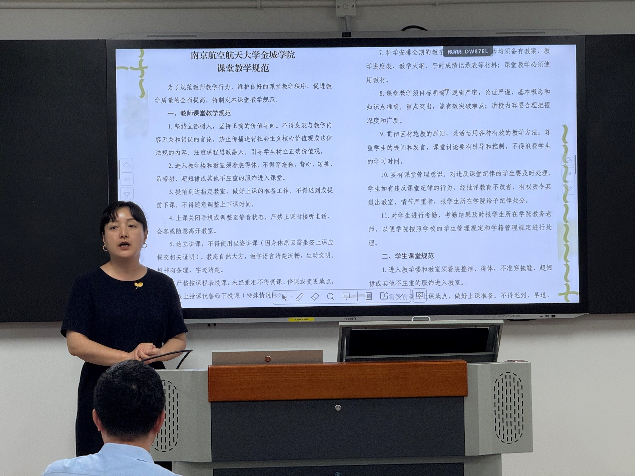 副院长谭静结合《南京航空航天大学金城学院课堂教学规范》文件精神,对教学与学生工作进行了具体部署:强调课堂教学规范的重要性;就实习指导工作提出要求,督促学生按时打卡、提交周记,提醒指导教师在实习过程中加强与学生的沟通,特别要提醒学生注意实习安全;要求班导及时召开新生班会,做好选课指导,向学生介绍专业学习、人才培养方案和创新实验室资源;鼓励教师不断提升自身发展水平,积极指导学生科研与竞赛。