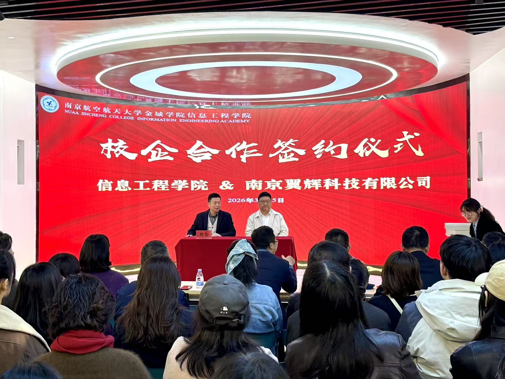 3月24日下午,南京航空航天大学金城学院信息工程学院(新E代数智未来产业学院)校企合作签约仪式、企业导师聘任暨专题讲座在学校A3楼智慧展厅顺利举行。南京翼辉科技有限公司总经理丁晓华、南京爱飞客科普有限公司副总经理葛健、南京明钥智能科技有限公司董事长王大可等企业代表,信息工程学院院长闻凯、副院长谭静、党总支书记唐亮、党总支副书记吴倩及学院师生代表共同参与本次活动。