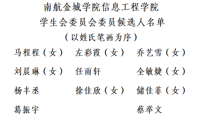 根据《南京航空航天大学金城学院学生会组织换届工作实施办法》和《南京航空航天大学金城学院信息工程学院学生会章程》,信息工程学院秉持“公平、公正、公开”的原则,经自主报名、资格审查、答辩等环节,经批准后,产生了新一届学生会委员会委员候选人名单,现公示如下: