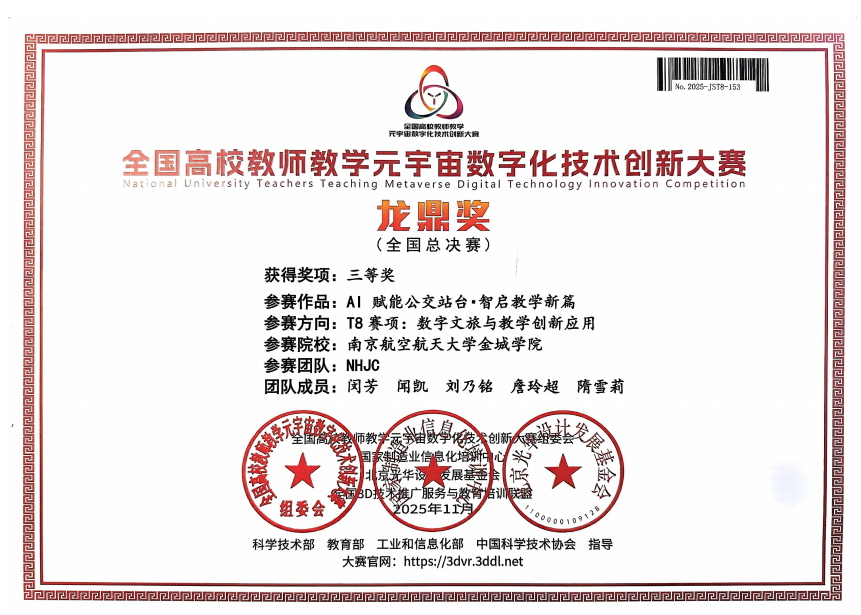 2025年11月,南航金城学院信息工程学院(新 E 代数智未来产业学院)教学团队NHJC参加了2025第6届全国高校教师教学元宇宙数字化技术创新大赛。参赛团队经过初赛、复赛层层选拔,入围总决赛团队,取得全国总决赛三等奖的好成绩。
